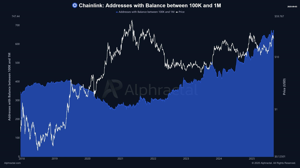 Alphractal berichtete, dass es inzwischen mehr als 600 Wallets gibt, die zwischen 100.000 und mehr als eine Million LINK halten. Dieses ATH wurde Anfang September erreicht – ein neuer Rekord.