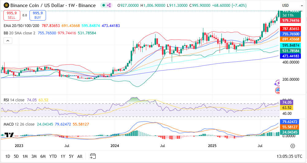 Aus der Marktperspektive betrachtet, trägt der Ausbruchvon BNB alle Merkmale eines starken Trends. Der Kurs hat den oberen Rand des Bollinger Bandes um $979 überschritten und liegt damit etwa 1,5 % über diesem Band und 26 % über seinem 20-Wochen-EMA bei $788.Diese Art von Struktur spiegelt eine Beschleunigung wider, birgt aber auch das Risiko einer kurzfristigen Übertreibung.