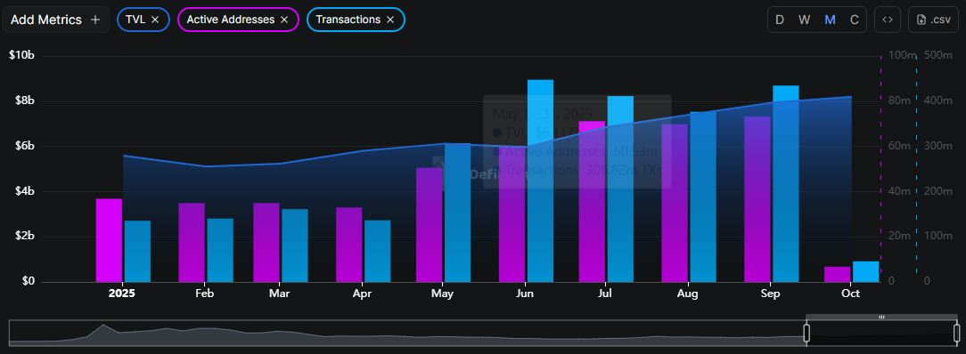 Nicht nur der Kurs zieht an. Auch die Nutzungskennzahlen der BNB Chain zeigen kräftiges Wachstum. So stieg die sogenannte Total Value Locked (TVL) in den vergangenen 24 Stunden um 2,5 Prozent auf 8,23 Milliarden US‑Dollar, so DefiLlama. Mit TVL ist der Gesamtbetrag gemeint, den Nutzer in Smart Contracts im Netzwerk hinterlegt haben, etwa in Kredit- oder Handelsplattformen.