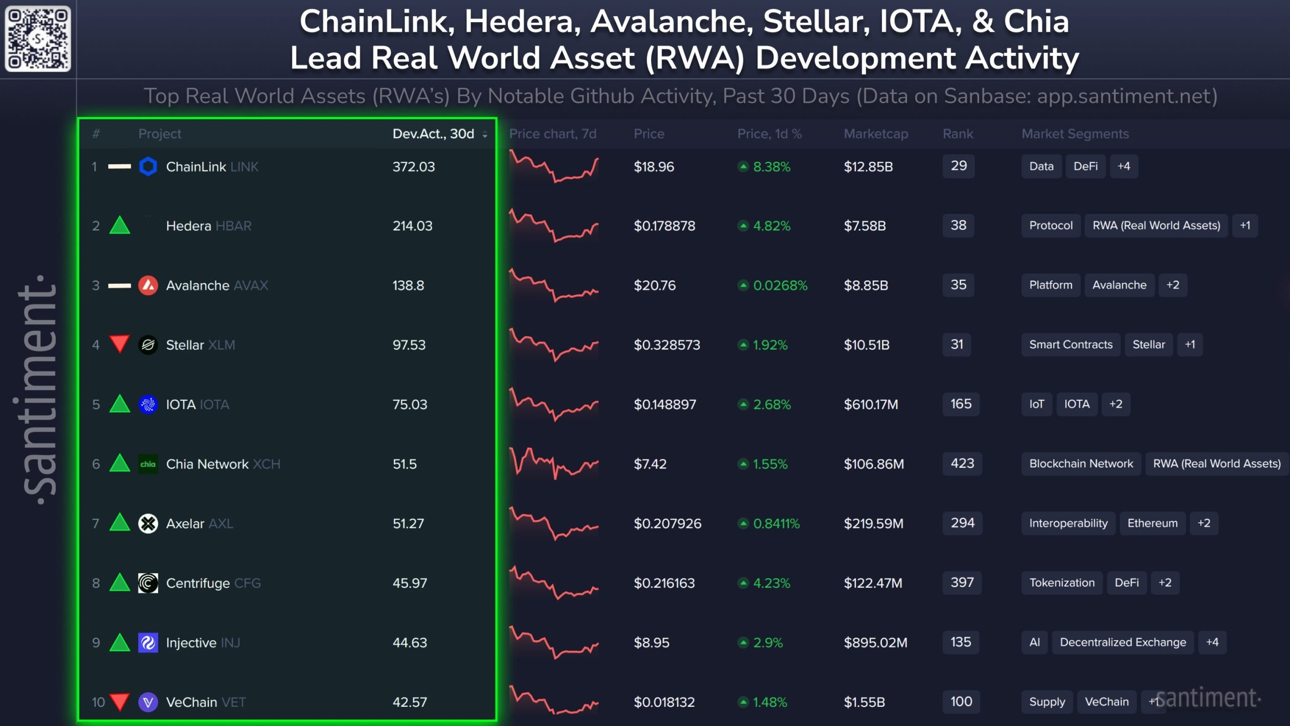 Santiment berichtet, dass die Entwicklungsaktivität im Bereich der RWA-Tokenisierung stark zugenommen hat. Chainlink, Avalanche, Stellar, Hedera und IOTA werden als die Top-Projekte genannt, die die den Fortschritt der Integration von Real-World-Assets durch konsistente GitHub-Aktivität und anderweitiges Engagement vorantreiben.