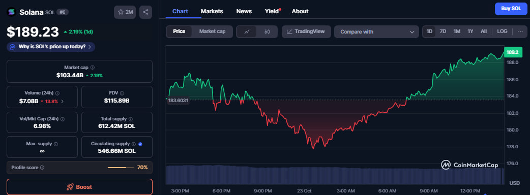 Solana wird bei 189 $ gehandelt. Er hat im vergangenen Monat fast 15% seines Wertes verloren, da die allgemeine Baisse des Marktes den Optimismus in Bezug auf die Tokenisierungsupdates überwog.