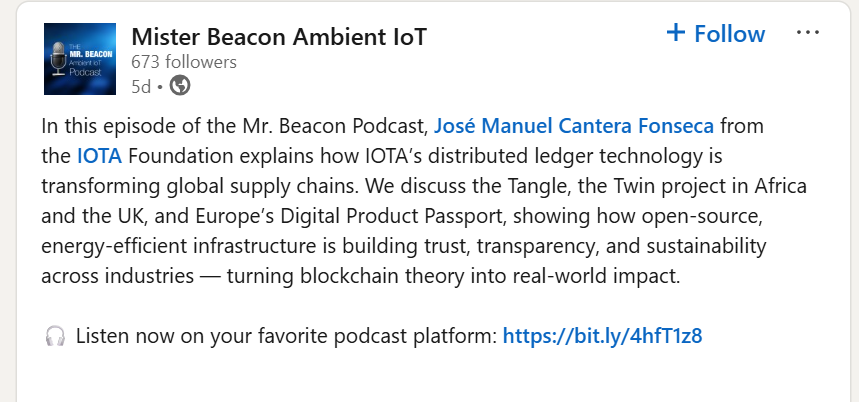 José Manuel Cantera, Vertreter der IOTA Foundation, nahm am Mr. Beacon Ambient IoT Podcast teil, um die Auswirkungen von IOTA in der realen Welt zu beleuchten. Er erklärte, wie die Tangle-Technologie von IOTA die Effizienz und Transparenz von Lieferketten von Afrika bis Europa verbessert.