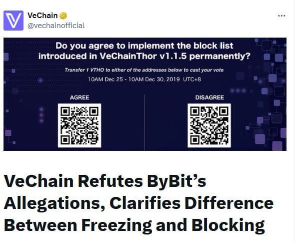VeChain wies diese Behauptungen entschieden zurück und stellte klar, dass der einzige relevante Vorfall vor fast sechs Jahren stattfand. Im Dezember 2019 genehmigte die VeChain-Community eine einmalige Sperrliste, nachdem ein Diebstahl privater Schlüssel zur Kompromittierung einer einzelnen Wallet geführt hatte.