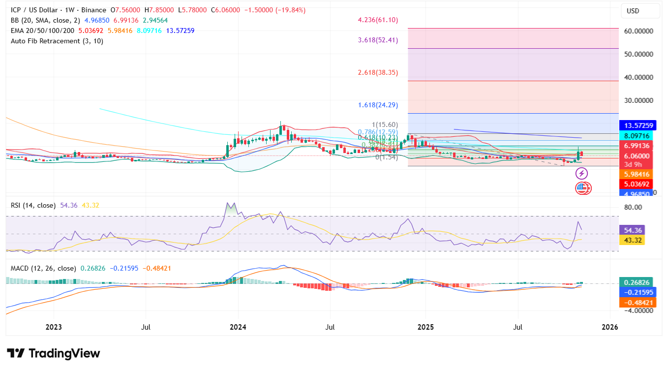 Aus Sicht der technischen Analyse ist der Wochenchart von ICP gemischt und hat einen vorsichtig optimistischen Ton. Der ICP-Token erreichte vor kurzem einen Höchststand von ca. 7,85 $, fiel dann aber auf 6,06 $ zurück, was einen Rückschlag von fast 20 % bedeutet.