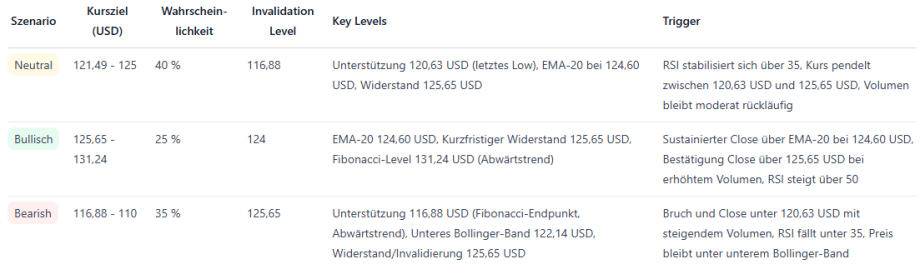 Erst eine Rückeroberung des Bereichs um 124,60 US-Dollar, bestätigt durch einen Anstieg über 125,65 US-Dollar, würde das Chartbild spürbar entspannen und Raum für eine technische Erholung bis in den Bereich um 131 US-Dollar eröffnen.