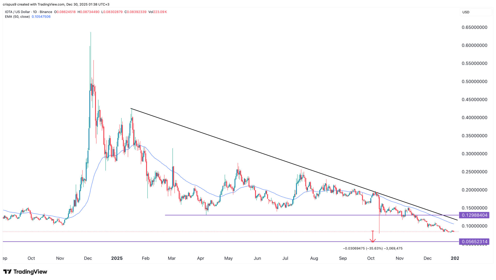 IOTA Token Chart | Quelle: TradingViewDer Tageschart zeigt, dass der IOTA-Token in diesem Jahr in einem Abwärtstrend geblieben ist. Er ist unter der absteigenden Trendlinie geblieben, die die höchsten Ausschläge seit Januar dieses Jahres miteinander verbindet.