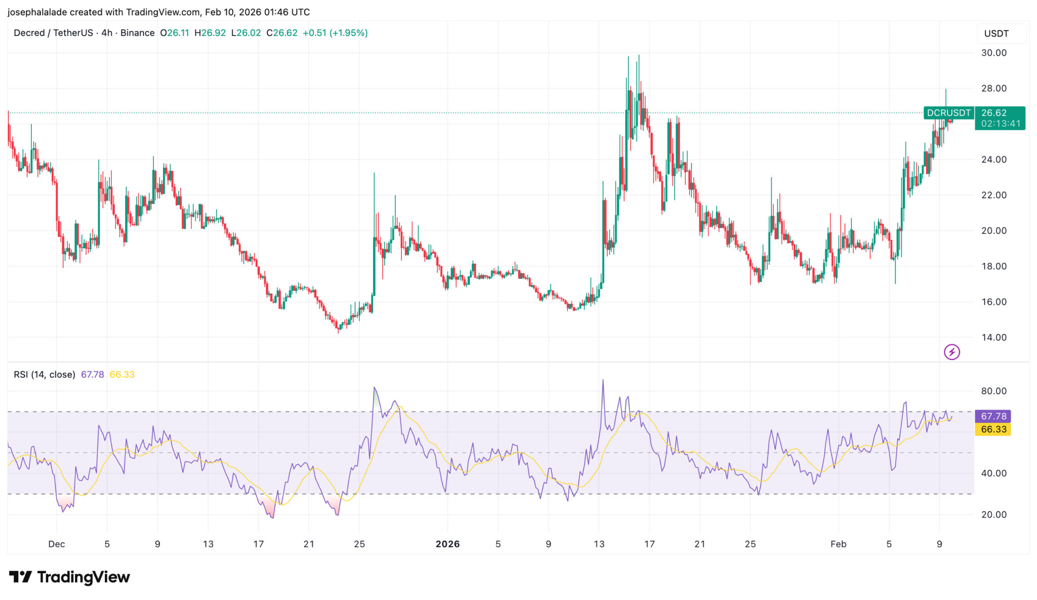 Das Momentum stützt diese Interpretation. Der RSI(14) hält sich nahe 67, wodurch der Decred-Kurs eher in einem Fortsetzungsmuster als in einer überkauften Situation bleibt. Es hat sich keine bärische Divergenz entwickelt, und die Rückgänge sind seit der Rückeroberung der 23-Dollar-Marke gering geblieben.