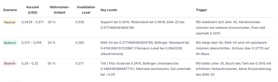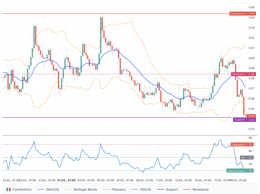Die kurzfristige Prognose bleibt bärisch mit erhöhtem Risiko, aber Chancen auf eine technische Gegenbewegung bestehen bei Stabilisierung. Wichtige Unterstützungen liegen bei 0,3415 US-Dollar (tief) und anschließend bei rund 0,33 US-Dollar; Widerstände bei 0,3618 USD und dem EMA‑20 bei 0,37115 US-Dollar. Ein stabiler Ausbruch über 0,37115 US-Dollar (EMA‑20) würde das kurzfristige Risiko merklich reduzieren und Raum bis 0,41503 US-Dollar (Bollinger Oberband) eröffnen. Ein Bruch unter 0,3415 US-Dollar würde die Abwärtsdynamik verstärken und tiefere Zielzonen wahrscheinlich machen.