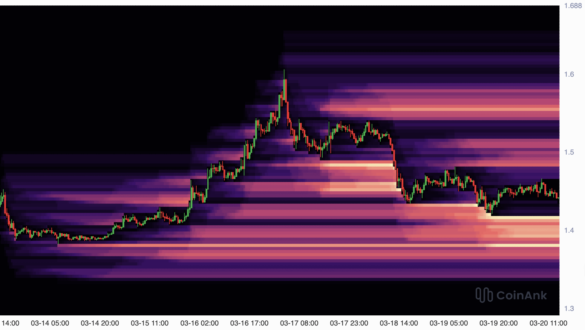 Gleichzeitig zeigt die Liquidation-Heatmap ein klares Bild auf der Unterseite. Besonders im Bereich zwischen 1,40 und 1,35 US$ befindet sich eine markante Liquiditätszone, die kurzfristig angelaufen werden kann.