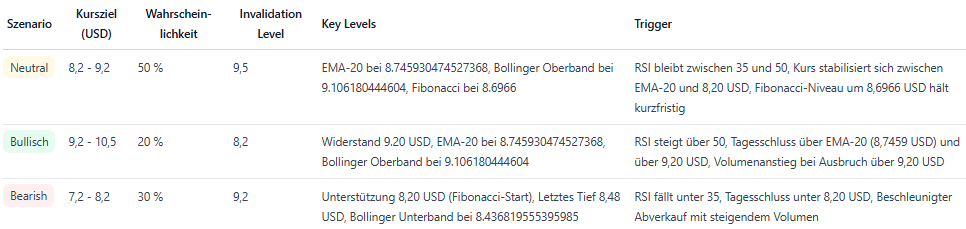 Die kurzfristige Prognose bleibt neutral bis leicht bärisch: Kurs unter EMA-20, schwaches Momentum und steigende Volatilität. Unterstützungen siehst Du bei 8,48 USD und 8,20 USD, Widerstände bei 8,75 USD und 9,20 USD. Ein nachhaltiger Ausbruch über 9,20 USD und eine Bestätigung über dem EMA-20 würden kurzfristig Kaufdruck erzeugen; ein Bruch unter 8,20 USD dürfte die Volatilität deutlich erhöhen. Für Dich: Beobachte RSI >50 und Close über 9,20 USD als bulliges Signal, bei Close unter 8,20 USD erhöhe Risikokontrollen.