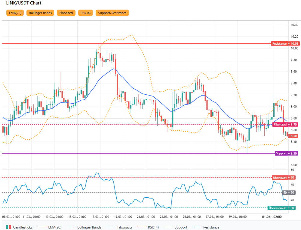 Der Kurs notiert unter dem EMA-20 (8,7459 USD) und zeigt seit dem 01.04. eine Abfolge von niedrigeren Hochs und tieferen Tiefs, was kurzfristige Schwäche signalisiert. Relevante Unterstützungen liegen bei 8,48 USD und bei 8,20 USD (Fibonacci-Start), Widerstände bei 8,75 USD (EMA-20) und 9,20 USD (letzte Spitze). Solange der Kurs unter dem EMA-20 bleibt, ist die Marktlage neutral bis leicht bärisch.
