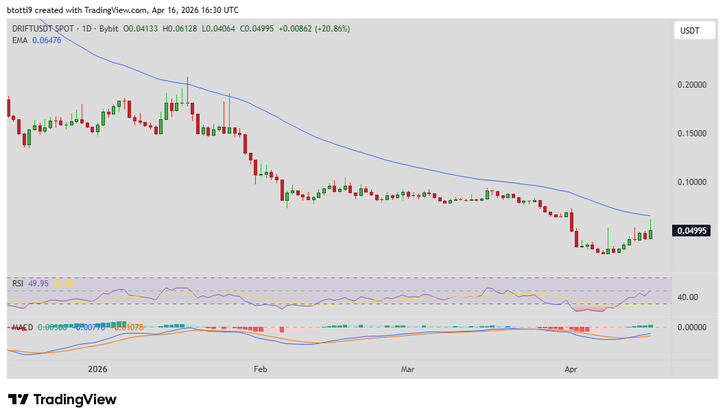 Der Governance-Token von Drift Protocol, DRIFT, stieg am Donnerstag um 20%, erreichte Intraday-Hochs über $0.061 und damit den höchsten Stand seit dem 1. April 2026.