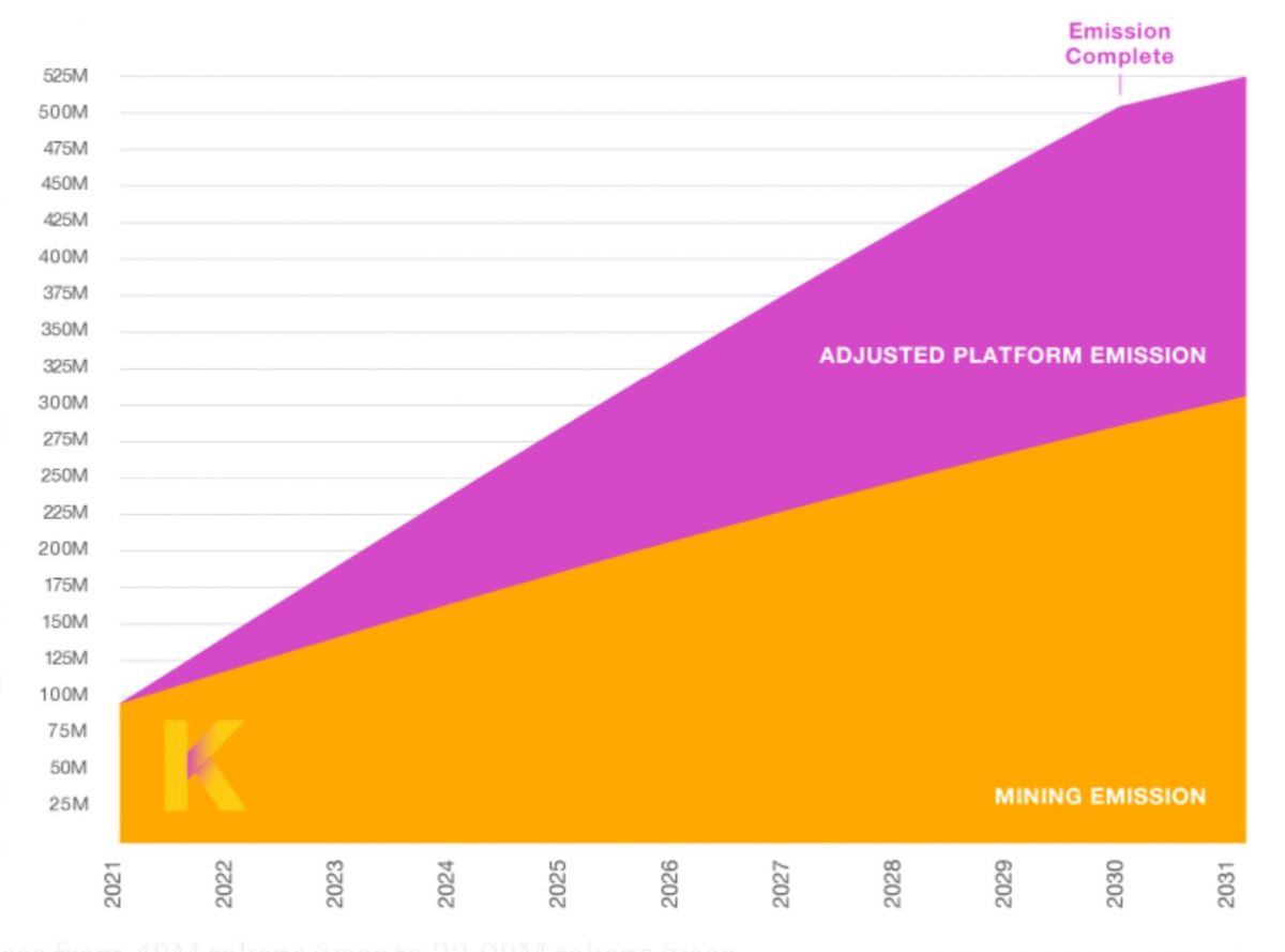Die jährliche Plattform-Emission beträgt 22,08 Mio. KDA pro Jahr. Gleiches gilt für die Anzahl an KDA, die derzeit jährlich durch das Mining in den Umlauf geraten, bzw. dem liquiden Bestand hinzugefügt werden.