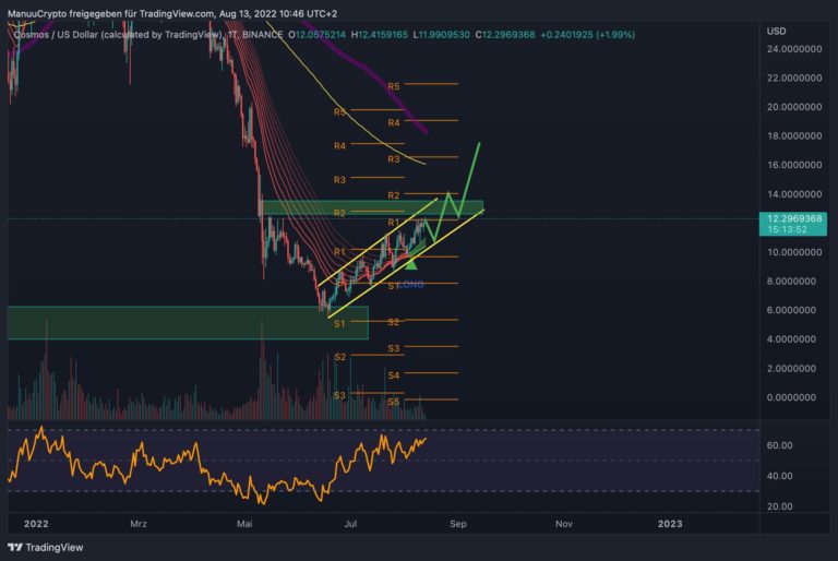 Cosmos (ATOM) befindet sich weiterhin in einem deutlich ersichtlichen Uptrend. Dieser begleitet uns nun bereits seit Mitte Juni. Seitdem hat sich der Kurs mehr als verdoppelt und wir nutzen unsere Uptrendlinie als Support.