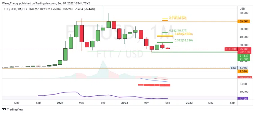 Zuvor wurde der $FTT Kurs im August am 0,382 Fib Widerstand bei rund 33,3 USD bärisch abgewiesen, womit der Trend bärisch bestätigt ist.