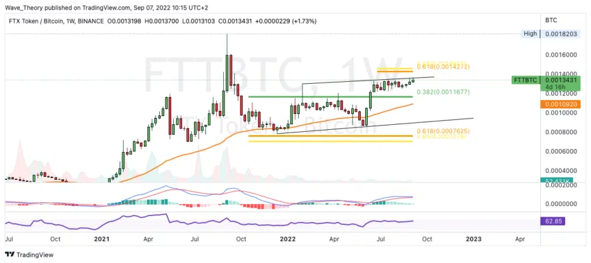 Gegen $BTC befindet sich der $FTT Kurs in einer starken Aufwärtsbewegung, welche aber bald zu einem Ende kommen könnte. Denn bei rund 0,00143 $BTC stößt $FTT auf signifikanten Fibonacci Widerstand. Ohne ein Bruch der Golden Ratio bei rund 0,00143 $BTC bleibt der Trend von $FTT eindeutig bärisch.