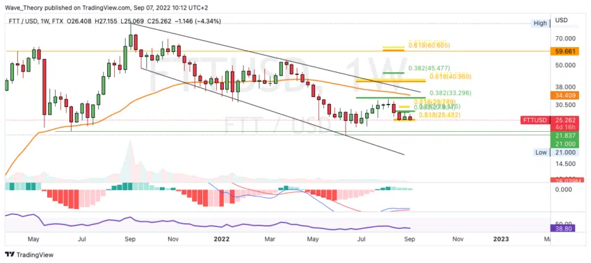 In der letzten $FTT Kurs Prognose schrieben wir: “Der FTX Börsencoin $FTT befindet sich jetzt an Golden Ratio Unterstützung, woran der $FTT Kurs bullisch abprallen könnte. Tatsächlich fiel der $FTT Kurs sehr stark, um die Golden Ratio Unterstützung bei rund 25 USD zu erreichen. Dort könnte der $FTT Kurs jetzt abprallen, um zum nächsten Fib Widerstand bei rund 28,2 USD zu steigen. Die Korrektur bleibt aber intakt, sofern der $FTT Kurs die Golden Ratio bei rund 30 USD nicht überwindet.“
