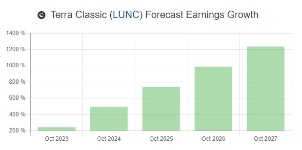 Zu den definitiv bullischen Prognosen zählt die Einschätzung vom Crypto Forecast Dienst Telegaon. So rechnen die Analysten schon für das laufende Jahr mit weiteren Kursgewinnen. Demnach könnte LUNC auf bis zu 0,0012 Dollar steigen. Das wäre ein erneuter Pump von 300 Prozent in den verbleibenden gut 2,5 Monaten des Jahres.