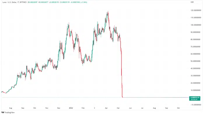 Betrachtet man den LUNC Kurs auf dem Tageschart, wirkt der Einbruch immer noch überwältigend. Fast 100 Prozent ist der Kurs abgerutscht und notiert zum Zeitpunkt der Veröffentlichung bei rund 0,00029 Dollar. Dennoch gehört LUNC laut den Zahlen von coinmarketcap.com weiter zu den Top 35 der wertvollsten Kryptowährungen der Welt und bringt es auf eine stolze Marktkapitalisierung von rund 1,7 Milliarden Dollar.