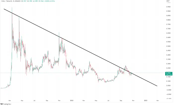 Auf dem Tageschart zeigt die Analyse von CHZ/USD, dass der Coin aktuell versucht eine extrem wichtige Widerstandslinie zu durchbrechen. Schon bei seinem All Time High im März 2021 hat der Kurs diesen Widerstand gebildet und ist seitdem gleich bei zahlreichen Versuchen gescheitert diese abfallende Linie zu überqueren.