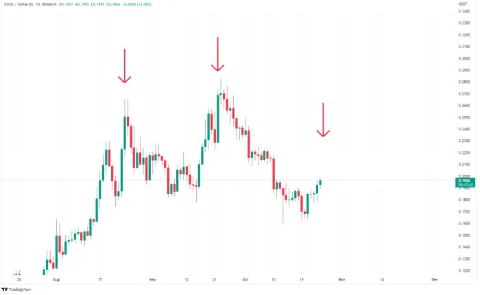 Dieses bärische Chartmuster wird erst dann ungültig, wenn es CHZ/USD gelingt, die vorherigen Hochpunkte vom 23. August und 23. September im Bereich von 0,26 bis 0,28 Dollar zu übertreffen. Bis zu dieser Entscheidung könnte der Kurs vom aktuellen Niveau aber noch einen weiteren Pump von bis zu 40 Prozent hinlegen.