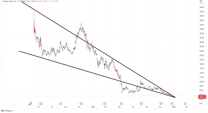 Derzeit bewegt sich der Kurs noch zwischen abfallender Widerstands- und Supportlinie, bei einem bullischen Breakout könnte COIN/USD jedoch ein technisches Preisziel von rund 230 Dollar erreichen. Zieht man den aktuellen Kurs von rund 33 Dollar heran, können Anleger, die jetzt COIN kaufen, im besten Fall eine Rendite von rund 600 Prozent erhalten. Damit könnte COIN zu einem sehr lohnenden Investment für 2023 werden.