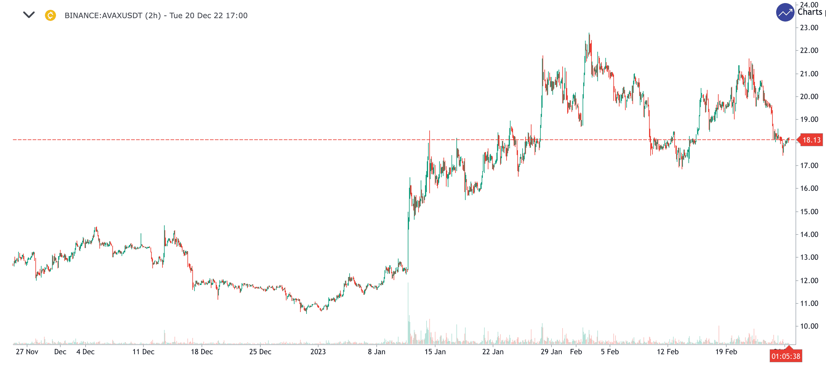 Weiterhin kam der AVAX Kurs von einem geringen Niveau. Ende des Jahres 2022 hat der AVAX Token massiv an Wert verloren. Allgemeine war Avalanche einer der größten Verlierer unter den Top-Kryptowährungen im Jahr 2022. Seit seinem Allzeithoch im November 2021 hat der AVAX Token Ende 2022 mehr als 90% verloren.