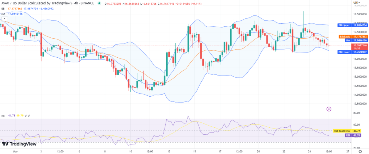 Der Wert der Münze ist auf etwa 16,76 $ gesunken und wird voraussichtlich weiter sinken. Allerdings hat der Preis auf dem aktuellen Niveau auch die lokale Unterstützung getroffen, was als Polster dienen könnte. Das obere Bollinger-Band hat einen Wert von 17,88 $ erreicht, während das untere Bollinger-Band einen Wert von 16,45 $ erreicht hat. Die Volatilität steigt. Der gleitende Durchschnitt weist derzeit einen Wert von 17,04 $ auf und ist relativ höher im Niveau. Andererseits sinkt auch der RSI-Score, der derzeit bei 41 liegt, stündlich.