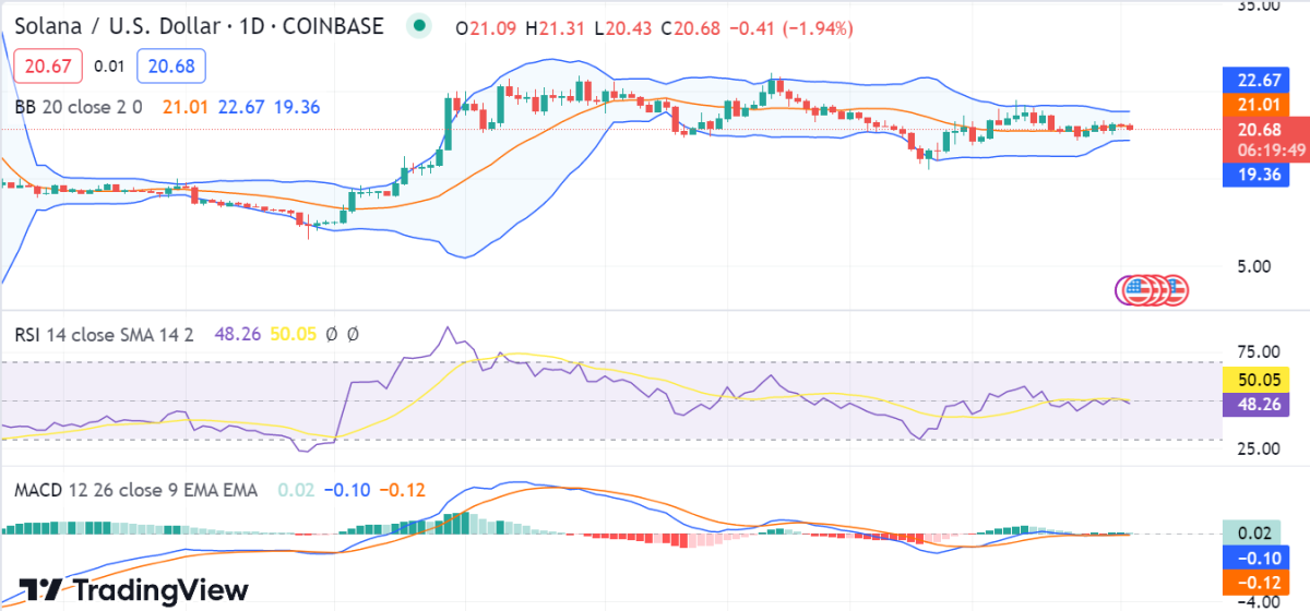 Ein Blick auf das tägliche Solana Preisdiagramm bestätigt, dass die Münze aufgrund ihres geringen Handelsvolumens und des Mangels an Käufern einem rückläufigen Trend auf dem Markt ausgesetzt war. Wenn es weiterhin rückläufig bleibt, könnte dies dazu führen, dass der $SOL unter das Unterstützungsniveau von 20,48 $ fällt. Das Widerstandsniveau für das $SOL/USD-Paar liegt bei 21,29 $, wobei ein Durchbruch über dieses Niveau eine Aufwärtsstimmung auf den Markt zurückbringt. Wenn die Bären jedoch die Kontrolle behalten und den Preis nach unten drücken können, könnte dies zu mehr Abwärtsdruck führen.