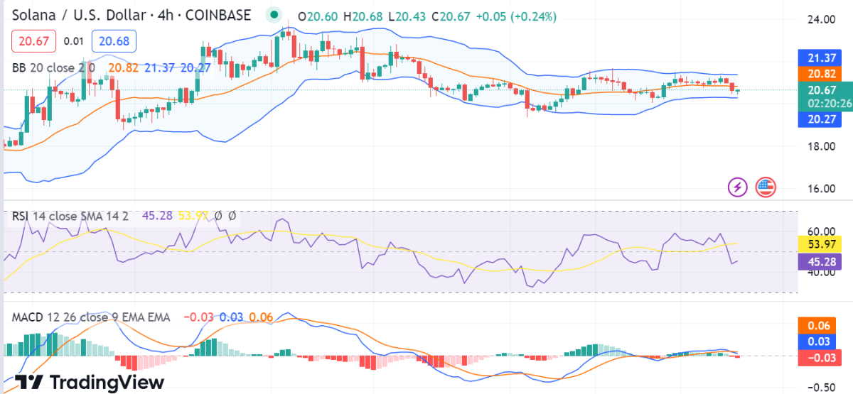 Die 4-stündige Solana Preisanalyse zeigt, dass die Münze derzeit bei 20,58 $ gehandelt wird und die untere Trendlinie des absteigenden Dreiecksmusters durchbrochen hat. Der Durchschnitt des Bollinger-Bands-Indikators ist auf 20,82 $ gesunken, während das obere Bollinger-Band einen Wert von 21,37 $ und das untere Band einen Wert von 20,27 $ anzeigt, was eine hohe Volatilitätsspanne für $SOL darstellt.