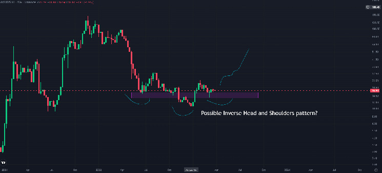 Auf dem Wochendiagramm ist eine Unterstützungszone zwischen 16,50 $ und 13,90 $ zu erkennen. Im Moment liegt der Kurs noch über dem Unterstützungsniveau vom Juni 2022. Die Grafik deutet außerdem darauf hin, dass sich in naher Zukunft eine inverse Schulter-Kopf-Schulter (SKS) Formation herausbilden könnte.