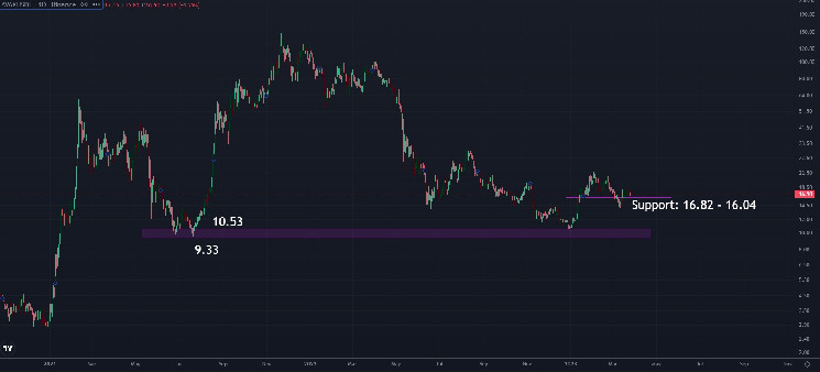 Sollten die Preise weiter fallen, ist ein wichtiger Unterstützungsbereich zwischen 9,33 $ und 10,53 $ auf dem Tagesdiagramm im Auge zu behalten, wo sich im Juni und Juli 2021 ein Doppelboden gebildet hat. Der aktuelle lokale Tiefststand wurde im Dezember 2022 erreicht, und es wird empfohlen, nicht tiefer zu fallen als dieser Wert. AVAX wird derzeit zwischen 16,92 $ und 17 $ gehandelt, wobei die Unterstützung bei 16,82 $ und 16,04 $ liegt.