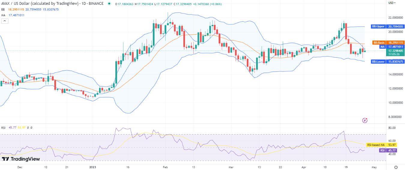 Die Avalanche Preisanalyse ist optimistisch, da die zinsbullische Dynamik anhält, und der Preis steigt heute. Die Münze behält erneut ihr früheres Preisniveau des letzten Monats bei, da der Verkaufsdruck über 17,6 $ liegt und Bullen nicht in der Lage sind, die nach dem 12. April 2023 erzielten Gewinne zu halten. Gestern wurde auch eine Korrektur beobachtet, als der Preis auf 18,1 $ stieg. Dieser Preisanstieg löste Verkaufsdruck aus, und eine scharfe Korrektur, die nur eine Stunde dauerte, korrigierte den Preis in den Bereich von 17 $.