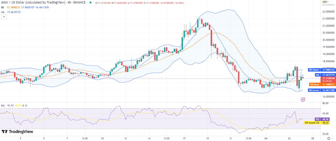 Das 4-Stunden-Chart zeigt eine mäßig hohe Volatilität. Die Ober- und Untergrenze der Bollinger-Bänder liegen bei 17,9 $ bzw. 16,4 $. Aber bei 17,1 $ könnte der mittlere Durchschnitt der Bollinger-Bänder knapp unter dem Preisniveau liegen, was auf die Unterstützung von AVAX hindeutet. Der RSI zeigt auch eine abgeflachte Kurve, was den Verkaufsdruck des Marktes über dem aktuellen Preisniveau anzeigt.