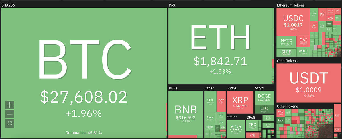 Der größere Kryptowährungsmarkt zeigte durchweg gemischte Ergebnisse: Bitcoin erholte sich mit einem geringfügigen Anstieg über 27.500 US-Dollar und Ethereum stieg mit einem Aufwärtstrend von fast 2 Prozent auf 1.800 US-Dollar. Unter den führenden Altcoins Ripple auf 0,42 $, während Cardano bei seinem vorherigen Preis von 0,37 $ blieb. Unterdessen Dogecoin bei 0,07 $, während Polkadot ebenfalls bei 5,4 $ verharrte.