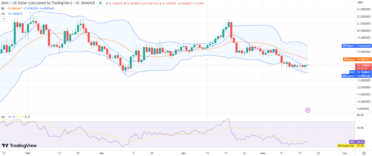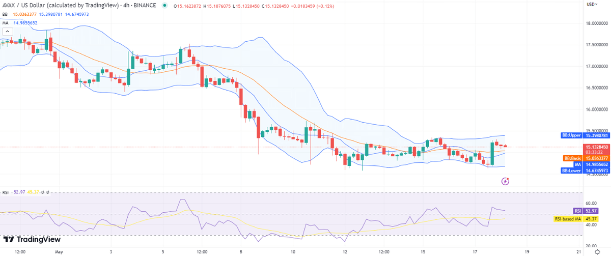 Laut der 4-Stunden- und 1-Tages- Avalanche Preisanalyse kämpft AVAX im Bereich von 15 US-Dollar, hat aber nach der Rückkehr des rückläufigen Momentums keine Unterstützung gefunden. In den letzten vier Stunden gab es einen kontinuierlichen Abwärtstrend. Ein weiterer Hinweis darauf, dass die Konsolidierung anhalten wird, besteht darin, dass sich der RSI, wie auf dem 4-Stunden-Chart zu sehen ist, weiterhin seitwärts bewegt und leicht nach unten tendiert.