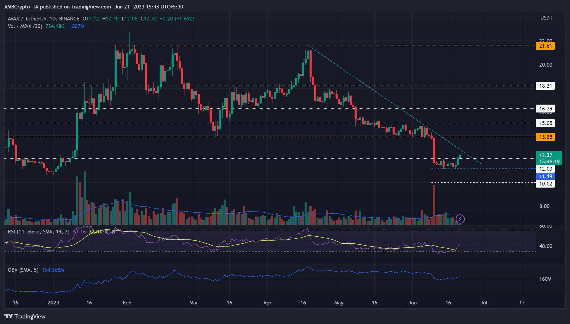 Trotz der Überwindung der 12-Dollar-Hürde ist AVAX noch nicht ganz über den Berg. Der RSI (Relative Strength Index), der den Kauf- und Verkaufsdruck abbildet, liegt seit April unter der 50er-Marke. Dies deutet darauf hin, dass im gleichen Zeitraum Verkaufsdruck vorherrschte.