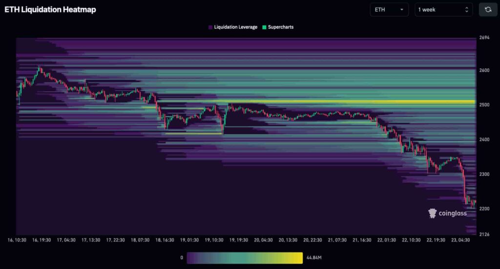 Unterdessen gehört auch die nach Marktkapitalisierung zweitgrößte Kryptowährung zu den besten Kandidaten für den Short Squeeze dieser Woche. Ethereum (ETH) könnte einen Anstieg von 13 % von seinem aktuellen Preis von 2.200 $ auf die konzentrierte Liquidität von 2.500 $ erleben.