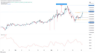 Der Preis-Chart zeigt, dass der IOTA-Token letzte Woche auf ein Tief von 0,2695 US-Dollar abstürzte, was der Performance von Bitcoin entsprach. Diese Korrelation setzte sich fort, als er am Dienstagmorgen auf 0,3662 US-Dollar stieg, seinem höchsten Stand seit dem 15. März.
