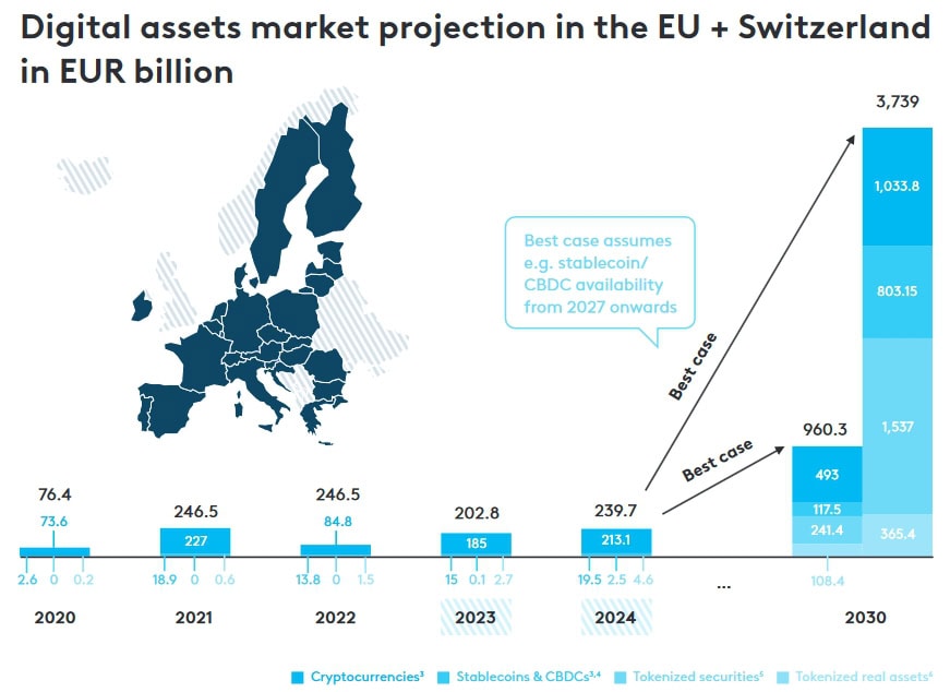Ein genauerer Blick auf die Zahlen offenbart, dass Tokenisierung als Megatrend den Krypto-Markt in Bezug auf die Marktgröße zurücklassen könnte. Die Autoren der Studie glauben, dass Krypto-Assets in der Schweiz und der EU im besten Fall 1,03 Billionen Euro an Marktkapitalisierung aufweisen werden. Bei den tokenisierten Wertpapieren und realen Vermögenswerten wie Immobilien sei hingegen kombiniert mit bis zu 1,9 Billionen Euro zu rechnen. Somit bieten Digital Assets laut den befragten europäischen Finanzinstitutionen in ihrer Gesamtheit ein nochmal deutlich größeres Potenzial als Bitcoin und Co.