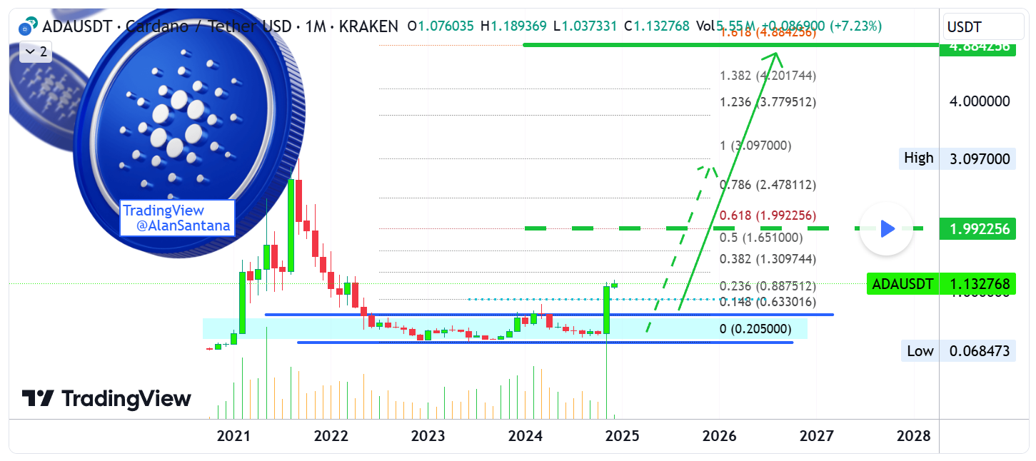 Der renommierte Kryptoanalyst Alan Santana auf TradingView behauptet, dass dieser Durchbruch den Ausbruch von ADA aus einem langfristigen Tief markiert, was auf erhebliche zukünftige Expansionsmöglichkeiten hindeutet.