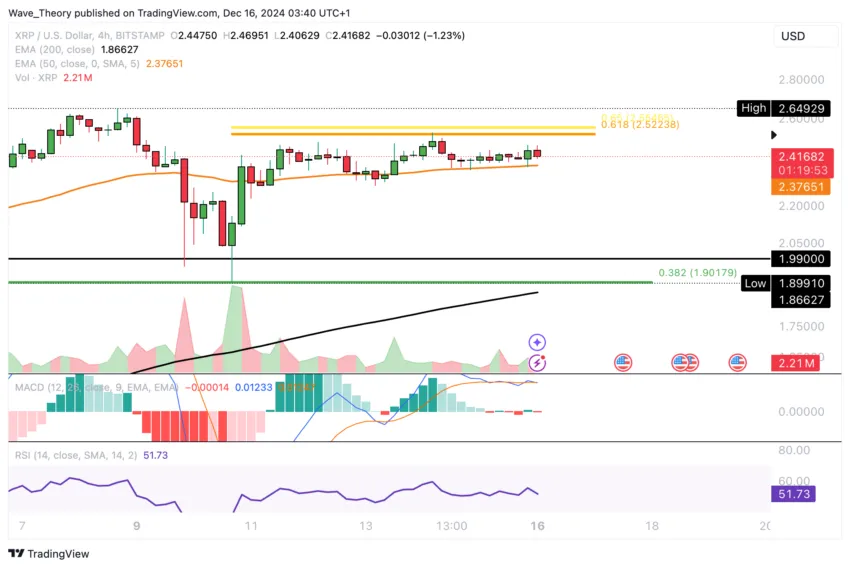 Ripple findet jetzt zusätzliche Unterstützung am 50-4H-EMA, welcher bei rund 2,376 USD liegt. Wenn sich Ripple darüber hält, liegt ein bullischer Bruch der Golden Ratio bei rund 2,52 USD nahe.