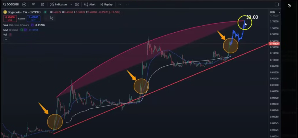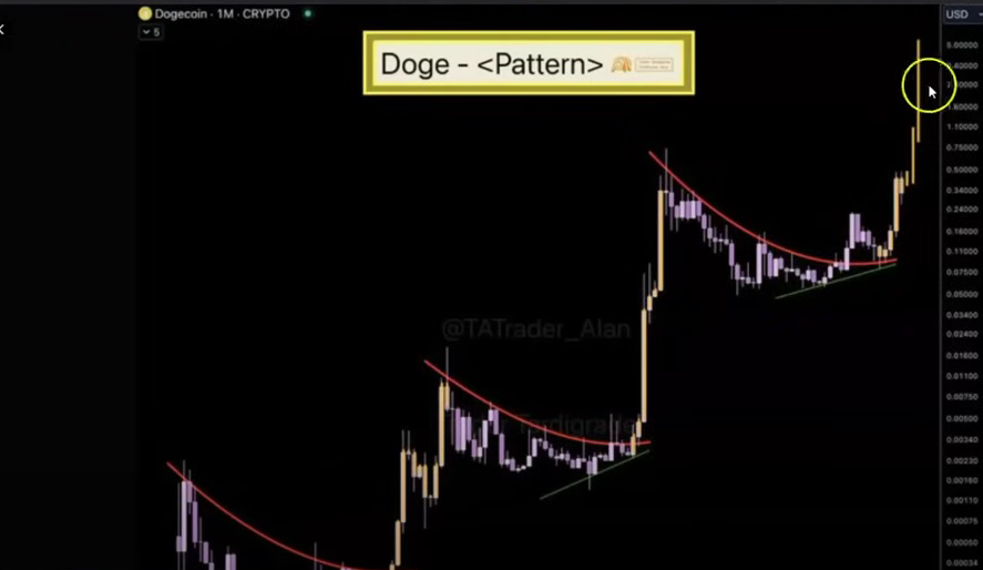 Durch die Verwendung eines Bogenmusters anstelle einer geradlinigen Projektion behauptete er, dass dieses Niveau zur historischen Performance von Dogecoin und seiner Neigung zu schnellem, exponentiellem Wachstum während Haussephasen passt.