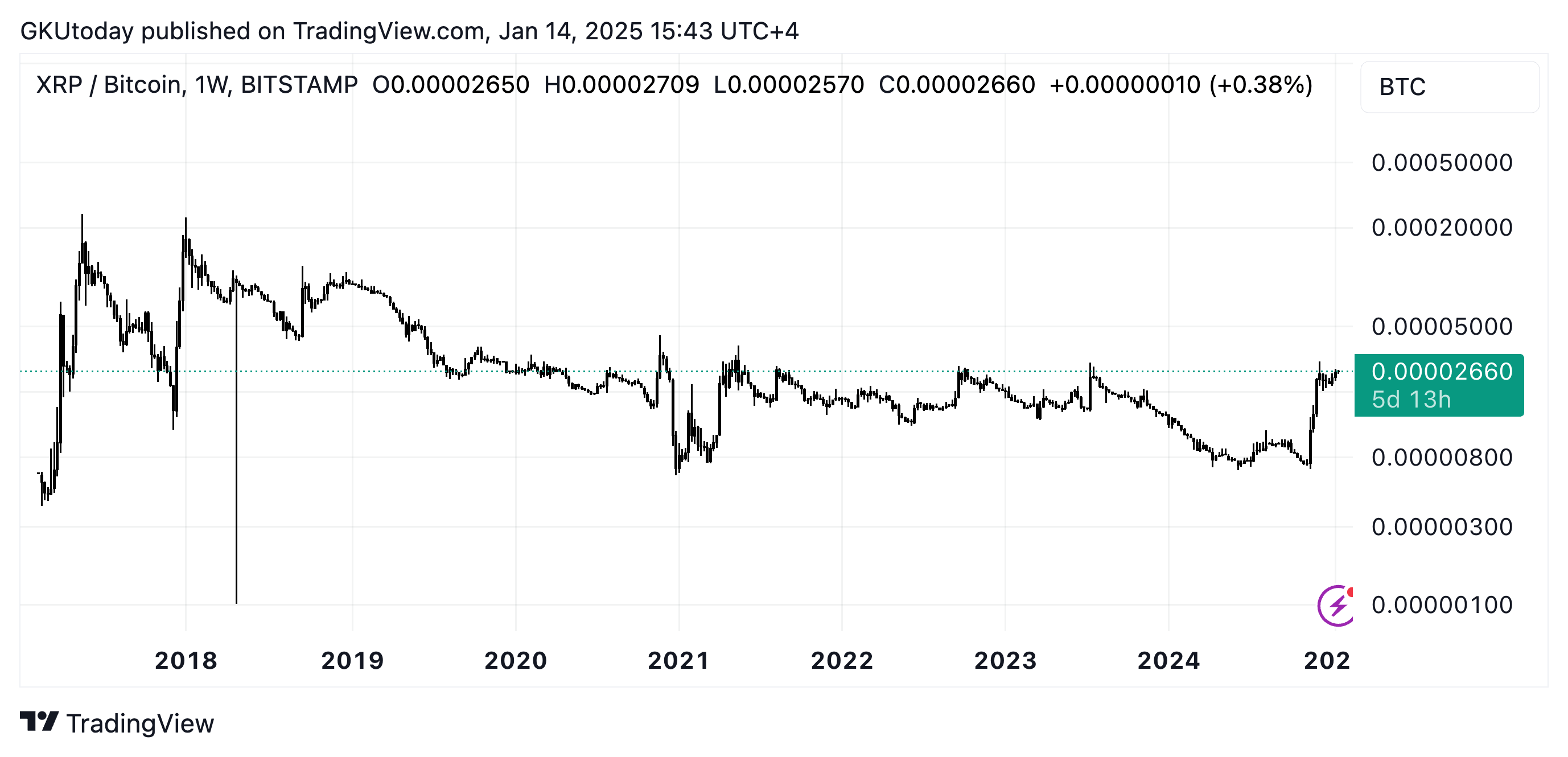 In den letzten zwei Monaten hat XRP ein beeindruckendes Wachstum von 271 % verzeichnet, wobei der Kurs von 0,00000733 BTC auf 0,00002678 BTC pro XRP gestiegen ist. Dieses Niveau stellte in der Vergangenheit eine hartnäckige Barriere dar, mit gescheiterten Durchbruchsversuchen im Sommer 2023 und Herbst 2022. Nun, da XRP diese Grenze endlich überschritten hat, scheint der Weg für weitere Preisentwicklungen frei zu sein.