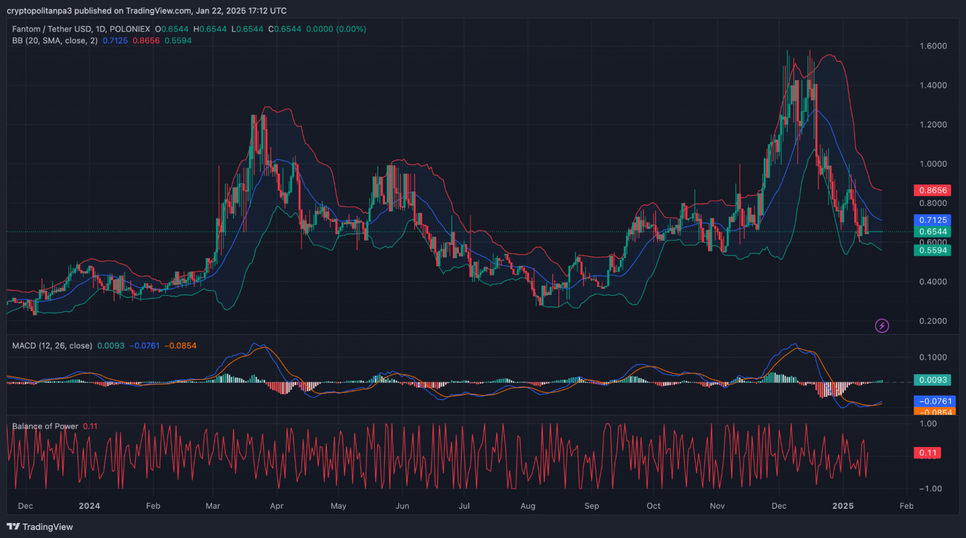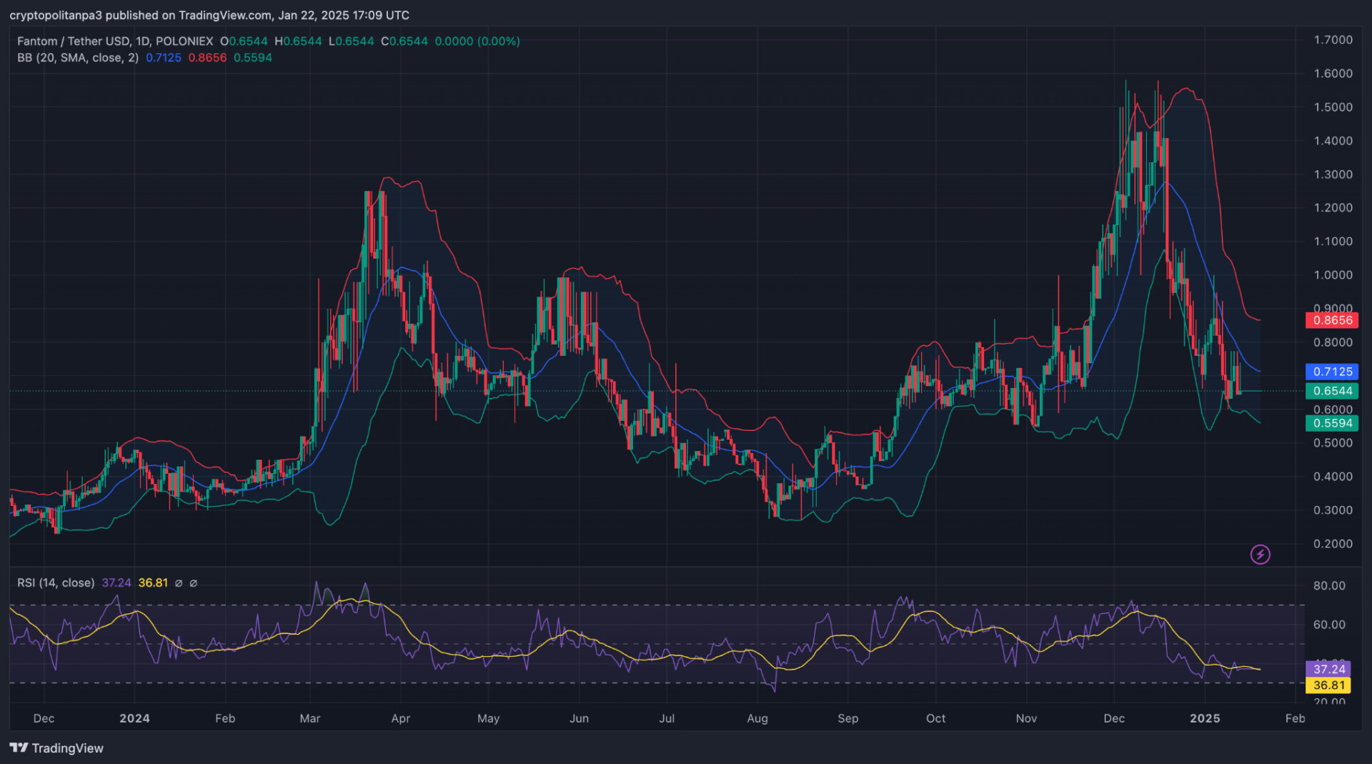 Am 22. Januar zeigt das 1-Tages-Chart für Fantom (FTM), dass sich der Preis um 0,6544 US-Dollar konsolidiert, mit einem unmittelbaren Widerstand bei 0,7125 US-Dollar und einer Unterstützung bei 0,5594 US-Dollar. Die Bollinger-Bänder weisen auf eine moderate Preisvolatilität hin, wobei sich der Preis derzeit in der Nähe des unteren Bandes befindet, was auf einen möglichen überverkauften Zustand hindeutet. Der RSI liegt bei 36,81 und tendiert zu einem rückläufigen Momentum, liegt aber nahe am überverkauften Bereich, was das Kaufinteresse trac könnte.
