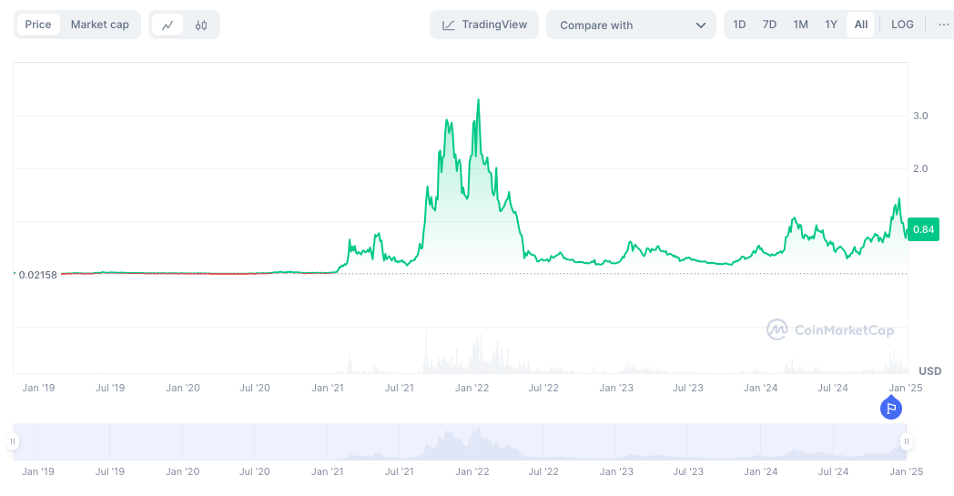 - Die Preise stiegen von 0,02 US-Dollar im Januar 2021 auf 3,48 US-Dollar im Oktober, getrieben durch die Einführung DeFi und die positive Marktstimmung. Das Jahr endete mit einer Korrektur auf rund 2,30 US-Dollar.