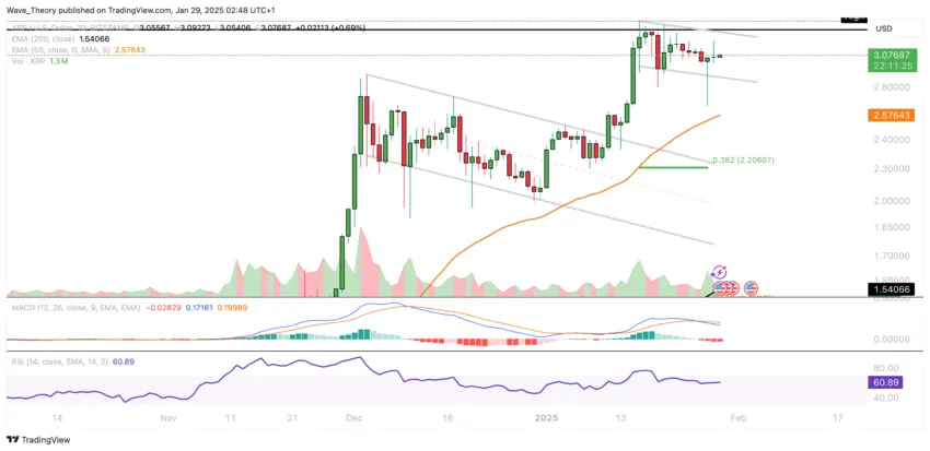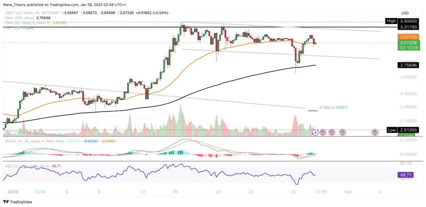 Lediglich das Histogramm des MACDs tickt derzeit bärisch tiefer. Aktuell stößt der Ripple Kurs am 50-4H-EMA bei rund 3,07 USD auf signifikante Unterstützung. Sollte diese Unterstützung brechen, könnte Ripple erneut zum 200-4H-EMA bei rund 2,75 USD korrigieren.