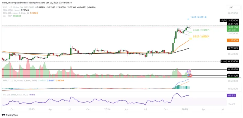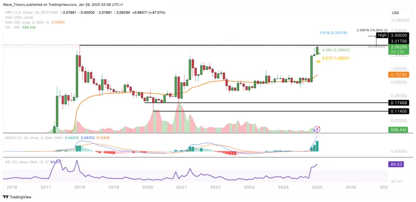 Sollte der Bullenmarkt noch länger anhalten und Ripple überwindet das ATH bei rund 3,4 USD, könnte Ripple womöglich bis zur 1.618 Fib Projektion bei rund 5,32 USD steigen. Das impliziert ein Aufwärtspotenzial von rund 74 % vom aktuellen Preisniveau.