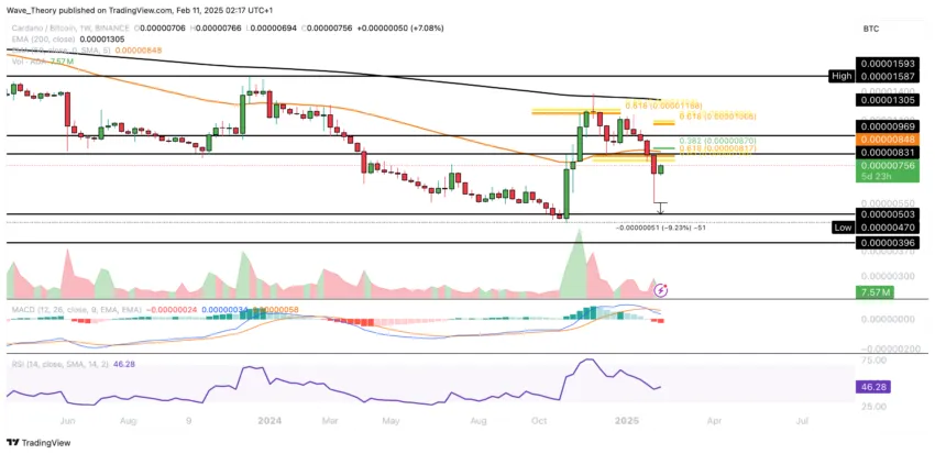 Nichtsdestoweniger ist der ADA Kurs wieder stark gestiegen, womit er bald auf signifikanten Widerstand stößt. Denn am 50-Wochen-EMA bei rund 0,0000085 BTC wartet signifikanter Widerstand.