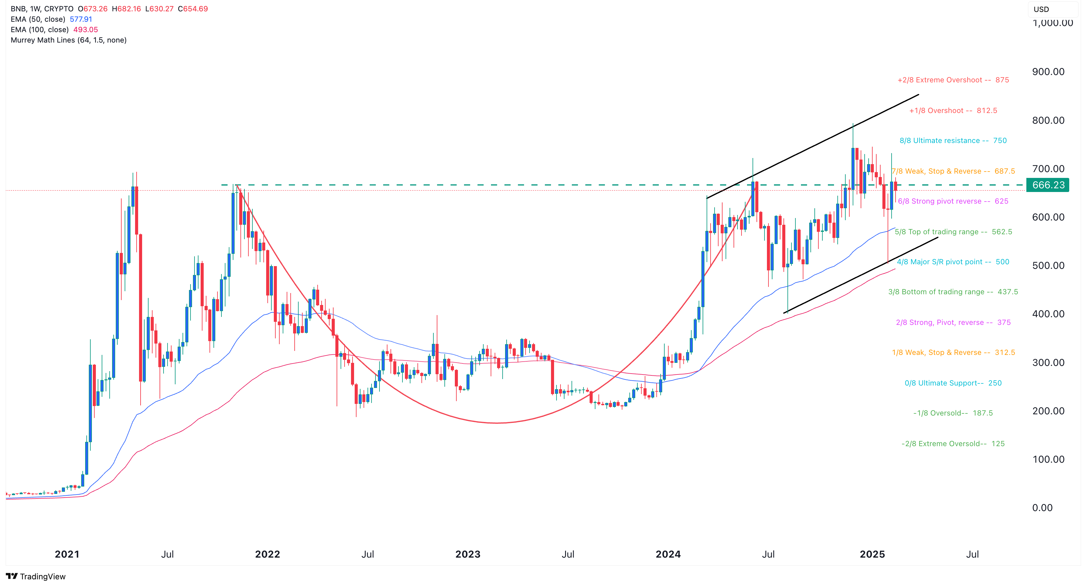 Die Kryptowährung hat eine Tassenformation (Cup & Handle) gebildet, was als ein äußerst bullisches Zeichen gilt. Zudem hat sie den starken Pivot-Umkehrpunkt des als Murrey Math Lines bekannten Indikators überschritten. Darüber hinaus hat der BNB Kurs eine Keilformation auf dem Chart ausgebildet.